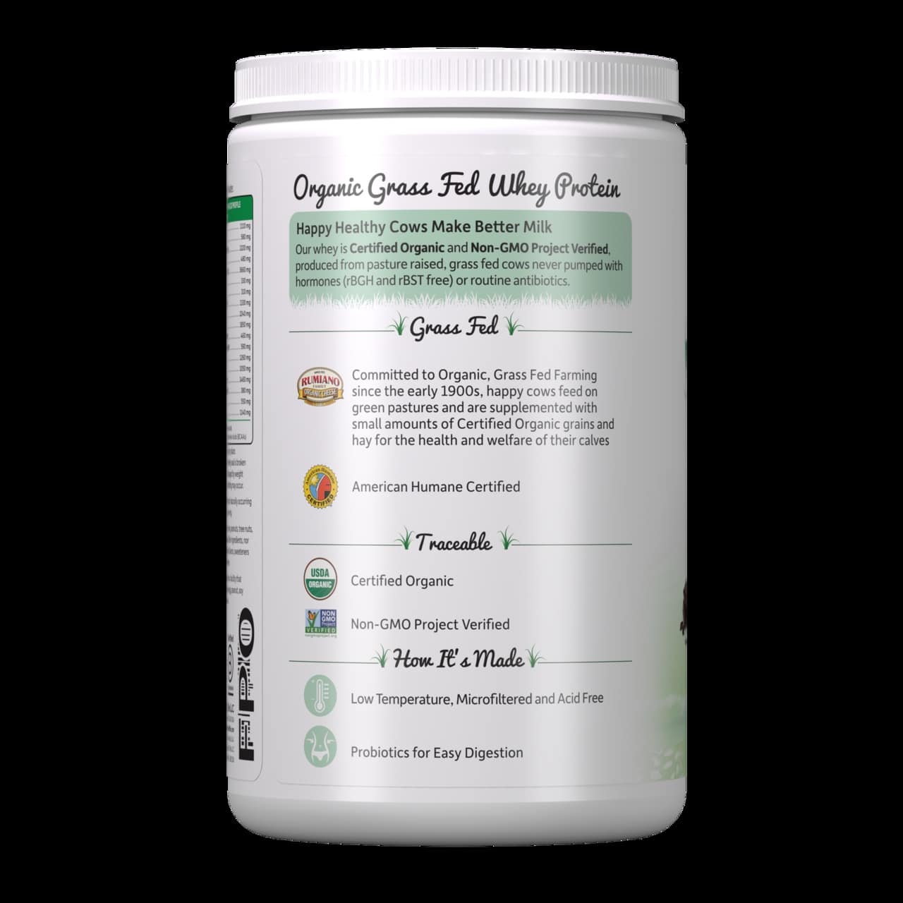 La proteína de suero orgánica es definitivamente «el suero más limpio». Nuestro suero está certificado como orgánico por la USDA y verificado por el Proyecto No-GMO, y se produce a partir de vacas criadas en pastos y alimentadas con pasto. Nunca son bombeadas con hormonas (libres de rBGH y rBST) ni antibióticos de rutina. Nuestras vacas Jersey viven en su hábitat natural al aire libre, vagando y alimentándose en pastos verdes. Estas vacas pastan en la hierba al menos 300 días al año y cuando se suplementa su alimentación, es sólo con piensos ecológicos certificados.