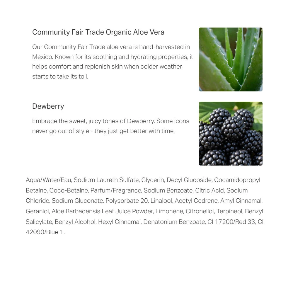 Nuestro Dewberry Shower Gel es fácil de usar gracias a su envase ergonómico que permite una aplicación cómoda. Su fórmula ligera se aclara sin dejar residuos, dejando tu piel limpia y fresca.